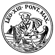 The Ring of the Fisherman (Latin: Anulus piscatoris; Italian: Anello Piscatorio), also known as the Piscatory Ring, is an official part of the regalia worn by the pope, who according to Catholic theology is the head of the Catholic Church and successor of Saint Peter, who was a fisherman by trade. It used to feature a bas-relief of Peter fishing from a boat, a symbolism derived from the tradition that the apostles were "fishers of men" (Mark 1:17). The Fisherman's Ring is a signet used until 1842 to seal official documents signed by the pope.[1] Since at least the Middle Ages it has been a tradition for Catholics meeting the pope to show their devotion by kissing the ring.[2]
