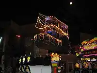 Masquerade Show in the Sky opened in February 1997, and ran in the resort's Masquerade Village. The $25 million show featured costumed performers and took place on floats which traveled along a 950-foot track, located 13 feet above the casino floor.[280][38][215] The floats represented showboats and gondolas. Each float weighed between 13,000 and 17,000 pounds. They traveled at a speed of three feet per second.[281] Masquerade Show in the Sky consisted of three distinct shows, and a fourth was added in 1998.[282] The show was free to spectators,[283] and visitors could also pay to ride in the floats.[43][284]