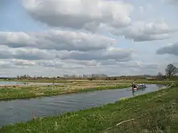The lower part of the river crosses over the Cut-off Channel in a concrete aqueduct. The Channel is a 28-mile (45 km) drain which runs from Barton Mills to Denver along the south-eastern edge of the Fens, and was constructed in the 1950s and 1960s. During times of flood it carries the head waters of the River Lark, the River Wissey and the Little Ouse to Denver Sluice.[25] On its east side are two sluices, so that flood water from the upper river can be diverted into the Cut-off Channel and the section between there and the Great Ouse isolated. The flood banks on this lower section are up to half a mile (0.8 km) apart, so that the meandering river can form a large lake.