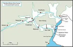 Disaster occurred on Lady Day 1644, when an exceptionally high tide flooded the Upper Levels, and broke through the walls of the New Salt Channel. The Commissioners authorised the construction of a new sea sluice at Kent Wall, and work began in May 1646, but in September, they decided that it should be built at Blackwall instead. The height of Knelle Dam was regularly adjusted, in an attempt to manage the amount of water that still flowed along the Appledore Channel, and the conflicting needs of navigation and drainage. The Great Freshwater Sluice below Appledore deteriorated, and failed in 1650. A new sluice with three channels was built in 1669. The financial burden on the Upper Levels as a result of the sea entering the Wittersham Levels was huge, as they had to pay rent on all land that was not available to its original owners,[18] and so in 1671, an agreement was reached that the sea would be excluded from the levels. Work began in 1680 to enclose areas of land on both sides of the valley, and was largely completed by 1684. The work included a new embanked channel for the Rother, which was built along the southern edge of the valley. It was called the Craven Channel, and ended at Craven Sluices.[19]