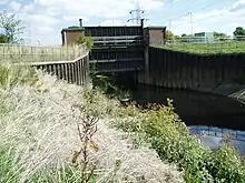 The first regulator to be installed was at Woodhouse Mill.[39] It is a vertical sluice gate, and is situated at the downstream end of the Woodhouse Mill washlands nature reserve. A railway embankment crosses the nature reserve, and flood arches allow the water to flood both sides of the tracks. There are no floodbanks between the river and the reserve, which results in it flooding soon after the gate is closed.[37] The mechanism here was manufactured by Ransomes and Rapier in 1956,[40] and the regulator was commissioned in 1959.[39] The Canklow regulator, situated close to the A630 link road from junction 33 on the M1 motorway, is also a vertical sluice gate, which when closed causes progressive flooding of seven washland areas on both sides of the M1, capable of holding 1,520,500 cubic metres (53,700,000 cu ft) of flood water.[37] It was installed in 1969 as part of a major road-building project, which saw the M1 motorway and the A630 road built across the washlands.[39]