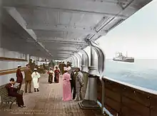 The speed of the new ships caused the United States postal service to choose NDL far more often than other carriers.[8] It was the beginning of the contest for speed in the Atlantic. In addition, their greater size—the Elbe was half again as large as the type which had been the norm in the Atlantic trade, which had not much changed in twenty years—[9] was accompanied by a change in layout which became the new norm. Until the Elbe, liners had almost universally had four decks, the two lowest devoted to cargo, the third to steerage passengers, and the top deck housing cabins; second-class accommodations were forward, first-class aft, each consisting of cabins to port and starboard of a small longitudinal saloon. On the Elbe there was a fifth deck on which a smoking room and ladies' drawing room were located, and the grand saloon was located athwart the ship from one side to the other, separated from the cabins.[9] She resembled the Guion Line's SS Alaska, but was wider and thus more comfortable.[10] This was also the beginning of the designing of ever more luxurious liner interiors designed to cause the passengers, at least in first and second class, to forget they were aboard ship.[11] The Elbe was the first ship to have its interior designed by Johann Poppe, the most distinguished architect and designer in Bremen, who was to design the interiors of all NDL's liners for the next 25 years.[12] In 1892, a voyage on SS Havel, the last ship of the Rivers class, prompted Mark Twain to call it "the delightfulest ship I ever saw" and publish an essay contrasting modern German steamships with their "dull, plain, graceless, gloomy and horribly depressing" predecessors as embodied by Cunard's SS Batavia.[13]