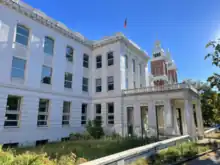 The Masonic Temple was built at a cost of $150,000 ($4.89 million in 2022 dollars) and became operational in 1905.[2] President Teddy Roosevelt, a Mason himself, was present at the groundbreaking and performed the ceremonial shoveling of the first dirt.[10] Expansion of the building took place between 1924 and 1925, spurred on by membership growth in the city's Masonic lodge. Expansion saw the original five bays of the colonnade extended along Riverside to the present 19-bay colonnade. An attic level was added at this time as well.[2] The building was sold for $1.1 million ($1.38 million in 2022 dollars) to an Australian business man in 2013.[11] As of 2022, the Masonic Temple building is used as an event hall.[12]