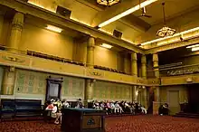 The interior of the building matches the grandeur of the Riverside façade, and maintains the theme of ancient Egyptian style motifs. The ballroom features a spring-supported "floating floor" while the Blue Room features the original red floral carpeting, the same used by Louis Davenport in his elegant Davenport Hotel. A fifth floor skylight that was covered up during World War II was brought back during an early-2000s restoration, allowing it to shine natural light onto the oak staircase leading to the fifth floor. On the fifth floor, the aptly named Falls Room offers views overlooking the Spokane Falls. There is also a 500-seat auditorium with horseshoe seating and a full balcony.[10]