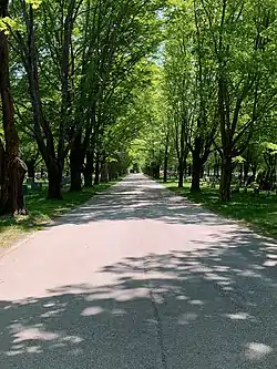 Although it was founded in 1869,[1] Riverside Cemetery has graves dating to the 1700s.[2] The cemetery's oldest burials are on the northern side; the more recent ones are on the southern side. A long driveway, which leads to another cemetery, separates the two.