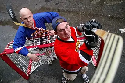 Road Hockey Rumble is a half-hour reality series produced by Paperny Entertainment and broadcast on OLN. The series uses a documentary format but crosses over into the genres of sports, travel, and comedy. It follows two Canadian hosts, Calum MacLeod and Mark McGuckin playing their way across Canada in a 13-game grudge match series of Road Hockey. From British Columbia to Newfoundland and all of the territories, they tap into the rivalries, legends and grit of Canada's most colourful and competitive towns. Friends in life but rivals in hockey, each host drafts their own team of locals to battle it out on the court.