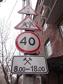 Road signs in Armenia are the same as in Russia and are based on the ГОСТ 32945-2014, ГОСТ Р 52289-2019 and ГОСТ Р 52290-2004 standards with the exception that inscriptions on road signs are in Armenian and English and the stop sign is bilingual (ԿԱՆԳ kang and STOP). The rules for the use of road signs and their technical requirements are governed by the Russian standards ГОСТ Р 52289-2019, ГОСТ Р 52290-2004 and the interstate standard ГОСТ 32945-2014.[1][2][3][4][5] Road signs in Armenia are divided into eight categories:
