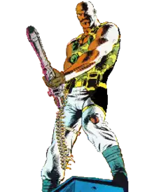 Roadblock grew up with a large extended family, but was shy despite being a Boy Scout and singing in the church choir.[1] Before he enlisted in the U.S. Army, Roadblock wanted to be a gourmet chef, and was working as a bouncer to earn enough money to attend Escoffier School in France. An army recruiter convinced him that he could learn to be a chef in the Army. After enlisting, Roadblock found Army food appalling, and transferred to infantry where he excelled at using heavy weapons. Roadblock is one of the biggest and strongest members of G.I. Joe, able to carry a fully loaded M2 Browning machine gun as a personal weapon, which can weigh up to 134 lbs, and usually requires a dedicated squad to transport and operate. Despite working in infantry, he still maintains his passion for making good food, and indulges in it while engaging in his secondary duty. He is a qualified expert with the M2 Browning .50 cal heavy machine gun, all Warsaw Pact heavy machine guns, M-16, and the M-1911A1 auto pistol.[2]