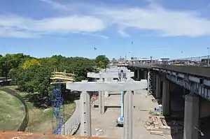 The interchange plaza connects with the over-water spans via a three-legged concrete viaduct that has a total length of more than 2.5 miles (4.0 km). The segments of the viaduct rest atop steel girders, which in turn are placed perpendicularly between concrete piers spaced 60 to 140 feet (18 to 43 m) apart.[21] Each pier is supported by a set of three octagonal columns. The viaduct is mostly eight lanes wide, except at the former locations of the toll plazas, where it widens. The viaduct once traversed Little Hell Gate, a small creek that formerly separated Randalls Island to the north and Wards Island to the south; the waterway has since been filled in.[25] The viaduct rose 62 feet (19 m) above the mean high water of Little Hell Gate.[23]