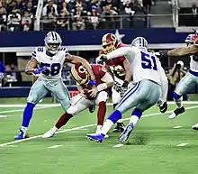 In week 4 against the New Orleans Saints, Quinn sacked Teddy Bridgewater twice in the 12-10 loss.[55] In week 6 against the New York Jets, Quinn sacked Sam Darnold twice in the 24-22 loss.[56] In week 7 against the Philadelphia Eagles, Quinn recorded a sack on Carson Wentz before leaving the game with a rib injury. Without Quinn, the Cowboys won 37-10.[57] He finished the season with 25 tackles, 11.5 sacks (led the team), 37 quarterback pressures, three passes defensed and two forced fumbles.[58][59]