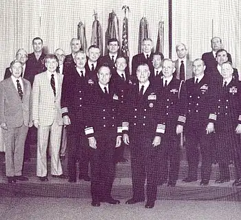 Front Row, left to right: Rear Admiral James Service, NWC President, and Admiral James D. Watkins, CNO.