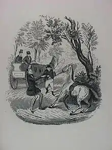 "Seymour first furnished the idea of Pickwick Papers. Mr. Dickens wrote the first numbers to his plates. / Seymour was one of the greatest artists since the days of Hogarth" (1697–1764). [Franklins Miscellany, 1836].[1]