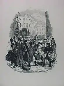 Seymour's suicide came after his struggle with mental illness and his breakdown in 1830. It is thought that Dickens had advertised for a new illustrator for The Pickwick Papers and it is clear that Seymour was struggling to design images in line with Dickens's requirements. "The Dying Clown" is harsh and emotional, a huge way from the funny and lighthearted illustrations which Seymour had envisioned for the series. Until English law changed in 1870, suicide could produce a verdict of felo de se (felon to self). This meant the person did not receive a religious burial and his family was denied any of his estate, which would go to the Crown by default. Therefore, no attributed royalties could go to his widow Jane Seymour from his work per se.[1] The commission then passed to Robert William Buss, but, these being judged unsatisfactory, were then passed to Hablot Knight Browne known as Phiz[2] from issue four of the magazine until its completion in 1837. Phiz also completed illustrations for the book version as well.