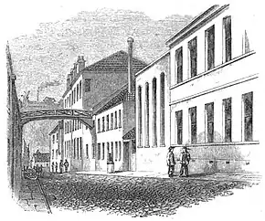 On 23 May 1823, a second S&DR Act received Assent with the Stephensons' deviations from the original route and permission for the use of "loco-motives or moveable engines".[29] In June 1823 the Stephensons and Pease opened Robert Stephenson and Company at Forth Street in Newcastle to build these locomotives, Pease lending Robert £500 so he could buy his share. As George was busy supervising the building of the railway, Robert was placed in charge of the works with a salary of £200 per annum. Robert also surveyed the route and designed the Hagger Leases branch, which was planned to serve the collieries at Butterknowle and Copley Bent. A new Act was required for the line, and Robert stayed in London for five weeks while the bill passed through its parliamentary process, Assent being given in May 1824.[30] The S&DR ordered two steam locomotives and two stationary engines from Robert Stephenson & Co. on 16 September 1824,[31] and the railway opened on 27 September 1825.[32][33]