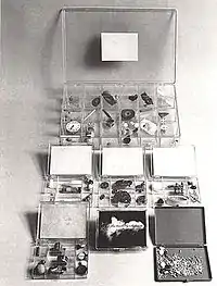 Over the years Watts contributed a number of works to Fluxus including a Flux Atlas, a collection of rocks from different countries, and a Flux Timekit, a series of boxes that housed objects that existed in different time scales, such as seeds to be planted, a time-lapsed photo of a speeding bullet and a pocket watch.[14] He also set up Implosions Inc. with Maciunas to mass-produce novelty items, and helped run the Flux Housing Co-Operative, an artist-run scheme that is held responsible for the rehabilitation and gentrification of SoHo, offering cheap loft spaces to artists throughout the sixties and seventies.[15] Watts himself was the first resident of the first working Flux Co-Op at 80 Wooster Street.[16] Jonas Mekas' cinematheque and Maciunas' apartment were housed in the same building which soon became the 'central Fluxus loft'.[17] He took part in the notorious Flux Mass, and was one of the very few original artists apart from Maciunas himself to have neither distanced himself from the movement, nor to have been expelled.