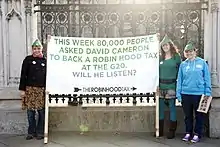 - ↑ "Robin goes global with actions in 43 countries". Robin Hood tax campaign. 24 June 2011. Archived from the original on 7 August 2011. Retrieved 29 July 2011.
