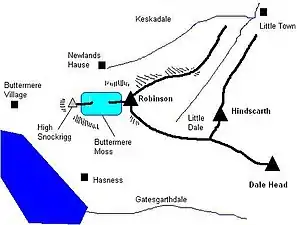 The western flanks of the fell fall to Buttermere, the village itself standing on Robinson's territory. The top and bottom sections are quite steep but the slope levels out at 1,500 feet (460 m) to accommodate Buttermere Moss, in Wainwright's words “ a wide marshy depression from which water cannot escape except by being carried away in the boots of pedestrians.”[1] At the head of the lower slope is the subsidiary top of High Snockrigg (1,725 feet; 526 m), a fine viewpoint for the Buttermere valley. On the south western rim of the Moss is Goat Crag, overlooking Buttermere lake.