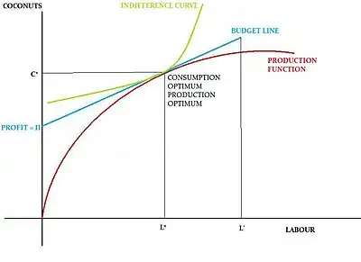 Crusoe's indifference curves depict his preferences for leisure and coconuts while the production function depicts the technological relationship between how much he works and how many coconuts he gathers. If the axes depicting coconut collection and leisure are reversed and plotted with Crusoe's indifference map and production function,[1] figure 2 can be drawn: