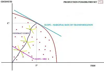 From the figure 8, it is clear that an economy operating at a position where the MRS of either Crusoe or Friday is not equal to the MRT between coconuts and fish cannot be Pareto efficient. This is because the rate at which, say Friday is willing to trade coconuts for fish is different from the rate at which coconuts can be transformed into fish. Thus, there is a way to make Friday better off by rearranging the production pattern.[1]