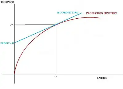 The above function describes iso-profit lines (the locus of combinations between labour and coconuts that produce a constant profit of Π). Profits can be maximised when the marginal product of labour equals the wage rate (marginal cost of production).[7] Symbolically,