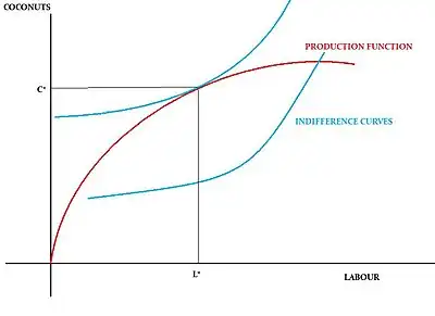 The point at which Crusoe will reach an equilibrium between the number of hours he works and relaxes can be found out when the highest indifference curve is tangent to the production function.[1] This will be Crusoe's most preferred point provided the technology constraint is given and cannot be changed. At this equilibrium point, the slope of the highest indifference curve must equal the slope of the production function.