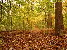 The Rock Creek Park Act authorized the purchase of no more than 2,000 acres (810 ha) of land, extending north from Klingle Ford Bridge in the District of Columbia (approximately the northern limit of the National Zoo), to be "perpetually dedicated and set apart as a public park or pleasure ground for the benefit and enjoyment of the people of the United States".[6] The Act also called for regulations to "provide for the preservation from injury or spoliation of all timber, animals, or curiosities within said park, and their retention in their natural condition, as nearly as possible".[7] Rock Creek Park is the oldest natural urban park in the National Park System.[8] Park construction began in 1897.[3]