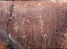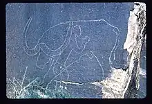 In 1955 and 1964 Henri Lhote had visits of several months to the region which allowed him to complete his former researches, to add hundreds of new descriptions and in 1970 to publish Les gravures rupestres du Sud-oranais in the series Mémoires du Centre de recherches anthropologiques préhistoriques et ethnographiques (CRAPE) directed at Algiers by Mouloud Mammeri.[1] A notable part of the work was particularly devoted to the engravings of the El-Bayadh region. For Henri Lhote the South Oran region constitutes one of the "three great centres of art of the antelope age"[2]: 194 with Tassili ("Oued Djèrat") and Fezzan.