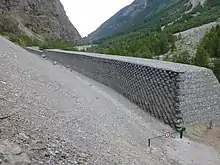 Rockfall protection embankments belong to the family of passive rockfall protection structures, comprising flexible barriers or galleries in particular.[2] They are intended for rockfalls with kinetic energies up to tens of megajoules and are preferred over flexible barriers when the design impact is higher than 5000 kJ.[3] Their declared advantages over other passive rockfall mitigation structures are low maintenance costs and reduced visual impact. Nevertheless, they are not appropriate on steep slopes and their construction generally requires extensive space and accessibility for heavy vehicles.