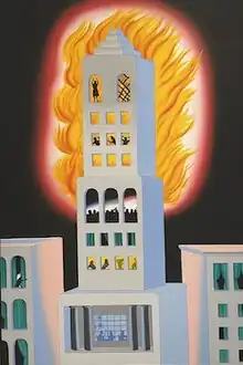 Brown's first solo exhibit at Phyllis Kind Gallery (Chicago, 1971) began his 26-year representation at PKG in Chicago (beginning in 1970) and New York (beginning in 1975).[1] Although affiliated with the Chicago Imagist school throughout his career, Brown's work evolved beyond the indeterminate definition of that "school." In the early 1970s he received acclaim for his paintings of stylized landscapes and cityscapes as stark backdrops for aspects of contemporary life as well as the "Disasters" series (1972), paintings of exploding buildings, followed by a procession of iconic, flat-patterned landscapes.[7]