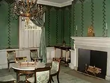The octagonal drawing room in the rear has paneled shutters, cornice moldings, and six-over-six sash windows, like the other rooms. The walls also contain paneled wainscoting, which is not found anywhere else in the house; at the time of the mansion's completion, the walls were intended to be decorated with wallpaper.[309] George Washington once used the octagonal drawing room as his headquarters.[53][312] One account claimed that 200 Native Americans once gathered in the room to give Washington a wreath.[312] Later on, Eliza Jumel set up a dais in the drawing room near the end of her life, where she would "see" imaginary guests with royal titles.[309] In the late 19th century, it was furnished with gilded ebony furniture and a 24-arm brass-and-glass chandelier.[313] A 1914 account cited the room as being decorated in the Louis XV style with Empire-style ceilings and fireplace.[303] By the late 20th century, the drawing room had been redecorated with late-18th century details like Chinese wallpaper.[288]