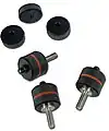 A second challenge was how to overcome the rotation of the suspended parts – the sub-chassis, platter, arm and cartridge – relative to the motor. This was done by re-imagining a suspension that had less freedom of lateral movement relative to the drive motor.[7] The Xerxes uses a relatively light medium-density fibreboard (MDF) top board on which the bearing and tonearm assemblies are mounted. Firm rubber "Blobs" mounted on the bottom board (along with the motor assembly) support yet decouple from the top board.[8][9] Aesthetically, the two boards are encased by a wooden surround fixed to the base board with screws. These design principles can be seen throughout the evolution of the Xerxes, right through to the Xerxes 20plus.[10][11]