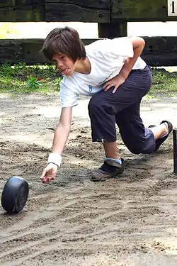 ![]() A Rolle Bolle player bowls the bolle towards the stake at the other end of the court | |