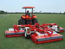 A roller mower, or rollermower, is a tractor-powered multi-spindled rotary mowers that have full width rollers front and rear. Most rollermowers attach to a four-wheeled tractor via the three-point linkage and are powered by the tractor's power take-off (PTO), though larger models connect three or more complete mowing decks to a separate chassis that is towed behind the tractor. Good rollermowers can produce a finish rivalling that of reel (cylinder) mowers while generally being far more robust and requiring considerably less maintenance. Modern machines can also cope efficiently with a wider range of grass lengths and densities than cylinder mowers.