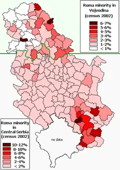 Romani people, or Roma (Serbian: Роми, romanized: Romi), are the fourth largest ethnic group in Serbia, numbering 131,936 (1.98%) according to the 2022 census. However, due to a legacy of poor birth registration and some other factors, this official number is likely underestimated.[3][4] Estimates that correct for undercounting suggest that Serbia is one of countries with the most significant populations of Roma people in Europe at 250,000-500,000. Anywhere between 46,000[5] to 97,000[6] Roma are internally displaced from Kosovo after 1999.