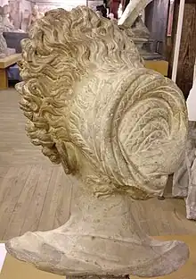 Julia Domna, wife of Septimius Severus, had a particularly notable hairstyle. Julia Domna was the wig's most influential patron. She wore a heavy, globular wig with simple finger-sized waves with a simple center parting. Julia Domna was the daughter of a high-ranking priest from Syria, and it has been suggested that her style was indicative of her foreign origins.[51] Despite being from the East, she adopted a wig to project a familiar Roman guise and particularly in order to imitate her predecessor, Faustina the Younger.[52] In 2012 Janet Stephens's video Julia Domna: Forensic Hairdressing, a recreation of a later hairstyle of the Roman empress, was presented at the Archaeological Institute of America’s annual meeting in Philadelphia. Foreign women often wore their hair differently from Roman women, and women from Palmyra typically wore their hair waved in a simple center-parting, accompanied by diadems and turbans according to local customs. Women from the East were not known to commonly wear wigs, preferring to create elaborate hairstyles from their own hair instead.[52] As time progressed, Severan hairstyles switched from the finger-waved center parting style, to one with more curls and ringlets at the front and back of the head, often accompanied by a wig.[53]