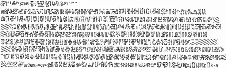 Nine lines on each side display ~ 900 glyphs, out of an original total of ~ 1,100. Fischer reports that some glyphs have been "corrected". The reading order of the parallel texts H, P, and Q is well established.