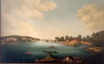 The name "Ropsten" stems from the fact that in old times, going back to the 13th or 14th century, people used to shout out loud from this area to Lidingö, a distance of about 750 meters, to call for a boat transport over to Lidingö, before the first regular rowboat ferry line was introduced and before the first bridge was built. In the old times, the part of the Ropsten area close to the waterfront was named Ropudden (corresponding to "cape shout"). The large rock or islet in the water close to this cape gave the place its name, "the rock at cape shout", Ropsten. The rock itself, however, was probably not used as a place to shout from, as it was surrounded by water (during average sea level conditions) according to old maps from the end of the 17th century, in particular a map from 1696. When there was an extreme low sea level[1] it was probably possible to reach the rock by foot, as indicated on the painting by Piere Joseph Trere from 1795.