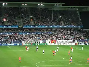 ![]() ![]() Top: Rosenborg BK's official logo Bottom: Rosenborg playing against Lyon at Lerkendal Stadion during the 2005–06 UEFA Champions League | |