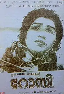 Rosie is a 1965 Indian Malayalam-language film, directed by P. N. Menon and produced by Mani Swami. The film stars Prem Nazir, Kaviyoor Ponnamma, Thikkurissy Sukumaran Nair and P. J. Antony. The film had musical score by K. V. Job.[1][2][3] Rosie was one of the first Malayalam films to be shot completely outdoors.