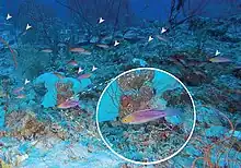 Cirrhilabrus rubrisquamis (male in circular close-up, females marked by white arrows) and anthias | |