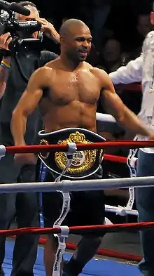 Roy Levesta Jones Jr. (born January 16, 1969) is an American professional boxer who holds dual American and Russian citizenship.[2] He has held multiple world championships in four weight classes, including titles at middleweight, super middleweight, light heavyweight, and heavyweight, and is the only boxer in history to start his professional career at light middleweight and go on to win a heavyweight title. As an amateur boxer he represented the United States at the 1988 Summer Olympics, winning a light middleweight silver medal after one of the most controversial decisions in boxing history.[3][4]