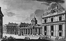 During 1766–1785 on the basis of Jakub Fontana's plans,[6] the southern wing of the castle, which was burnt on 15 December 1767 was rebuilt (2 destroyed floors, a new elevation on the south side with three avant-corps or risalti, the division of the façade by lesene and pilasters with Ionic capitals).[9] Between 1774 and 1777 the monarch's private apartments were furnished.[9] They consisted of the Prospect Room (with landscapes by Canaletto), the chapel, the Audience Chamber, and the Bedchamber, while between 1779 and 1786 the Senate Apartments were completed, consisting of the Ballroom, the Knights Hall, the Throne Room, the Marble Room, and the Conference Chamber.[7] These rooms contained pictures and sculptures depicting great events in Poland's history, as well as portraits of Polish kings, generals, statesmen and scholars (including Copernicus and Adam Naruszewicz).[6] In 1777, a gilded bronze altar presented to king Stanislaus Augustus Poniatowski by Pope Clement XIV, was installed in the new Chapel of the Royal Castle, so-called Saxon Chapel (today's concert hall).[14] The Castle also housed the rich royal collections including 3200 pictures, classical statues, about 100 000 graphics, in addition to medals, coins, and a fine library, to house which a separate building was erected in 1780–1784.[15] The new library building housed many books, gems, drawings, coins, maps and plans belonging to the monarch. The Royal Library's book collection amounted to 16 000 volumes of various works, 25,525 drawings, 44,842 etchings in 726 bound volumes, overall a number of 70,000 etchings—fancy dress balls were also held in this hall.[15]