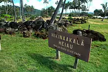 In ancient times Wailua Bay was a main port of entry as you directly enter the Wailua River and easily travel inland. Near the river mouth, on the south side of the river is Hikinaakala at Hauola heiau, a place of peace, health and healing, where ancient Hawaiians worshipped the rising sun.[2] Many ancient artifacts have been found in the area and petroglyphs are still seen here. This heiau also served as a pu’uhonua, or place of refuge, where defeated warriors or criminals fleeing prosecution could stay safe from pursuit. In ancient times refugees remained within the walls for days giving offerings to the gods and seeking forgiveness.[2]