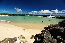 The first major beach along the Royal Coconut Coast is Lydgate Beach Park. It is extremely popular for families and is just south of the Wailua River. It has a large, double-sectioned salt water pool, created by a lava rock wall in the ocean. The smaller pool is frequented by families with toddlers and small children, and the larger pool is ideal for swimming and snorkeling [6] Young children are drawn to Kamalani playground, an extravagant playground with two different sections nearby, connected by a paved path. Lydgate is one of Kauai's most popular beaches for swimmers, picnickers, campers, fishermen, surfers, windsurfers, divers and beachcombers. It is a lifeguarded beach, with several restroom and shower facilities.