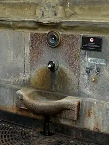 The Harrogate Improvement Commissioners Board's 1841 Harrogate Act established the principle that the poor should not be excluded from the perceived medicinal benefits of Harrogate's sulphur water. In order to conform to the act the Pump Room provided an outside tap which anyone could use at any time. After 9.30 am the Pump Room's attendants stopped serving well water inside the building. From this time onward the outside tap was the only source of well water. In the early days of the building an attendant supervised the tap.[14] This tap still exists today and it still works, although it is not recommended to try the water, due to the health risks involved.[12]