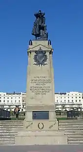 When the Second Boer War required more troops to reinforce British forces in South Africa, the 1st Battalion was sent there in February 1900, and fought at the Battle of Doornkop in May 1900.[8] A memorial to the fallen of the Second Boer War, incorporating a sculpture by Charles Leonard Hartwell titled "The Bugler", is at Regency Square, Brighton. The Sergeant Bugler sounded the charge of The Royal Sussex that swept The Boers from their formidable position at Doornkop.[9] A smaller bronze casting of The Bugler is held by the National Army Museum.[10] A silver reduction copy is also held by The 2nd Battalion Princess of Wales's Royal Regiment Officers' Mess.[11]