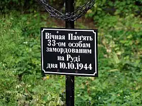 Ruda Różaniecka massacre (Polish: Zbrodnia w Rudzie Różanieckiej; Ukrainian: Вбивства в Руді-Ружанецькій) — execution of Ukrainians in Ruda Różaniecka (now - in the Subcarpathian Voivodeship of Poland), committed on October 10, 1944, by soldiers (military police) of the Milicja Obywatelska and local Poles, in retribution for the killing of Polish foresters & game keepers, resulting in the death of 33 Ukrainians (according to other sources - 32). Relatives of those killed only after the eviction learned about the fate of their loved ones, but do not know the place of their burials.[1]
