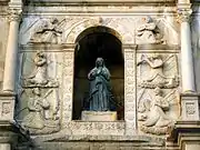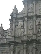 The façade is shaped like a retable and themed around the Assumption of Mary.[2]: 122 Likely influenced by Japanese Christian craftsmen who worked on it, the ruins of St. Paul's include carvings with heterodox images that draw from Asian traditions, including Mary stepping on a seven-headed hydra, described in accompanying Chinese characters as "Holy Mother tramples the heads of the dragon".[2]: 122 The base of the structure has six Chinese guardian lions carved from stone.[2]: 122