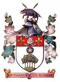 The hurst of trees with a representation of the Pole Star above are a play on the name Northwood. The mitre and fleurs-de-lys refer to the Abbey of Bec Herlewin in Normandy, to whom the Lordship of Ruislip was granted, where there was a cell of the Order. The Manor was later seized by Henry V and granted as part of the endowment of King's College, Cambridge. The Abbey and the college were dedicated to St. Mary, one of whose symbols is a fleur-de-lis. The 'rye slips' are a play on the name Ruislip. The wild boar shows that the Lordship was an ancient one, granted when the land was forest roamed by wild boars.[14]