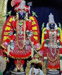 According to the Vaikhanasagama, Rukmini should be depicted on the right side of Krishna, her image golden-yellow in complexion. Her hair is supposed to be tied up in a fashionable knot, and should also be adorned with flowers. Her right arm should be hanging down, and she should hold a lotus in her left hand.[21][22] She is supposed to be adorned with various ornaments.[23]